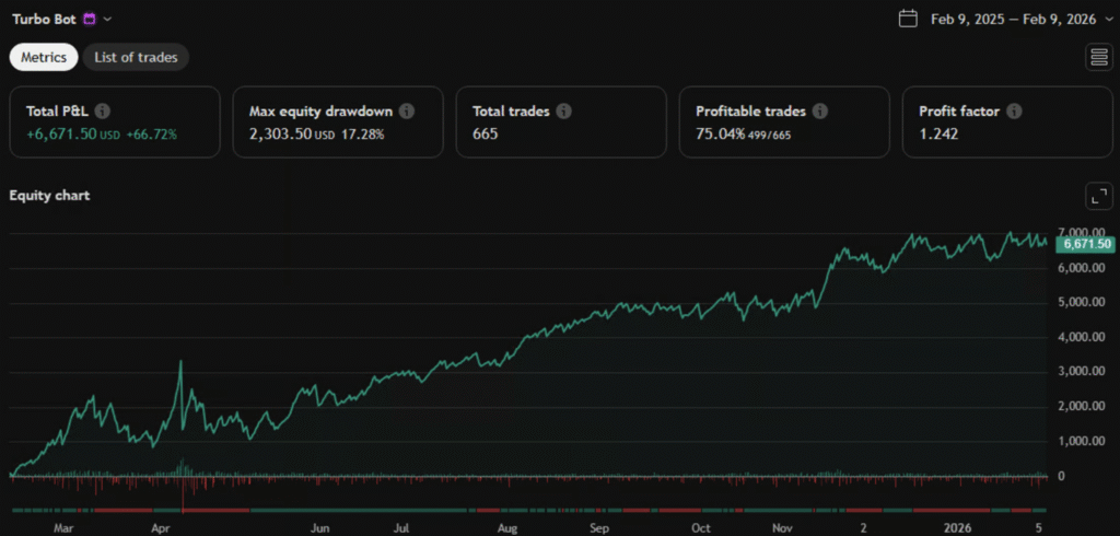 Unlike reversal-based strategies, Turbo Bot is a momentum continuation system. It waits for all monitored timeframes to agree on direction, then enters in that direction. The strategy includes multiple entry modes, adaptive risk management, and built-in drawdown protection.